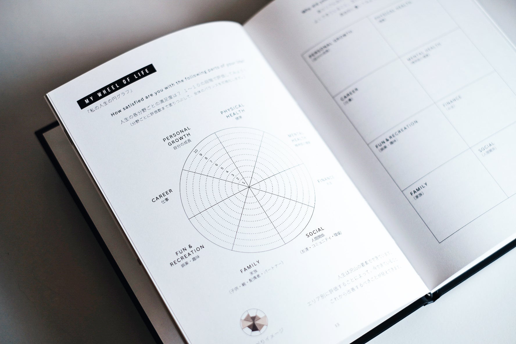 人生の円グラフ: 「仕事」「家族」「趣味」など、人生の大きな項目ごとに自分の満足度を円グラぐで表し、これから意識を向けたい部分を探ります。